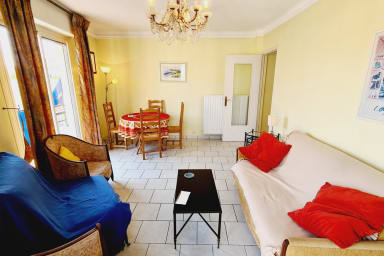 At the bottom of the Petit Juas district, few hundred meters from shops, the train station and the Croisette beaches. Close to all amenities, on Avenue Saint-Jean, in a quiet area near the city center. Located on the 4th floor of a well-maintained building with an elevator. One-bedroom apartment featuring an entrance hall, a living room with a sofa bed and a balcony, and a bedroom with double bed