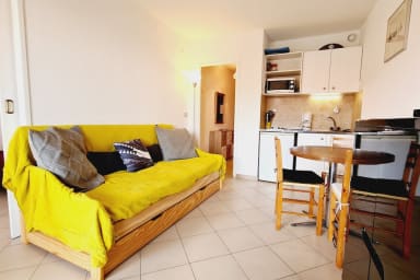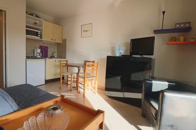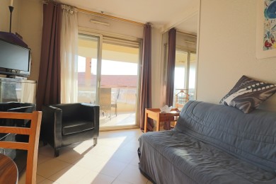 Appartement au bas du Petit Juas, à 7 min du Palais. Proche commerces et gare. Entrée avec salle de bains et WC séparés, séjour avec cuisine ouverte et terrasse, chambre donnant également sur la terrasse.